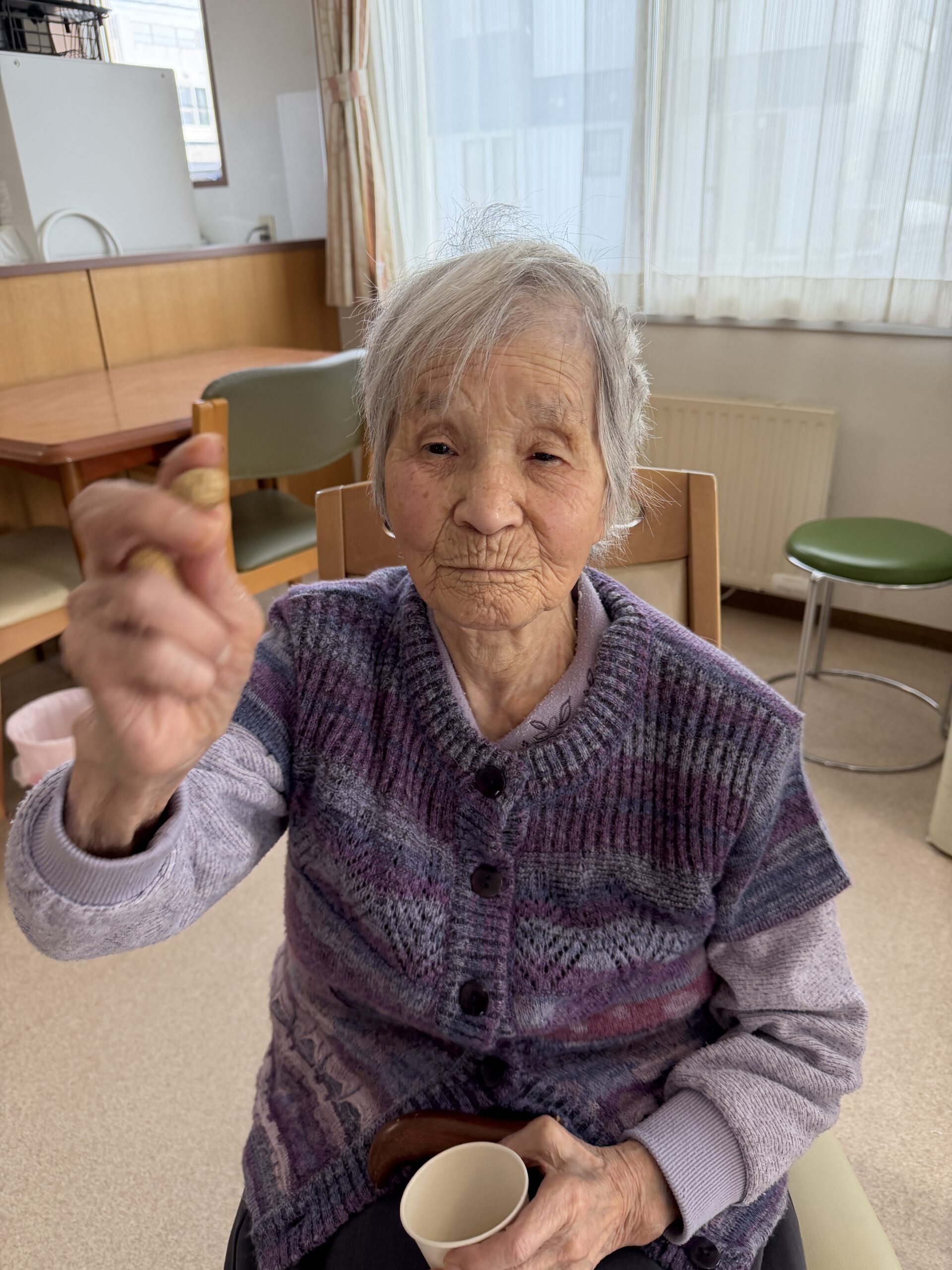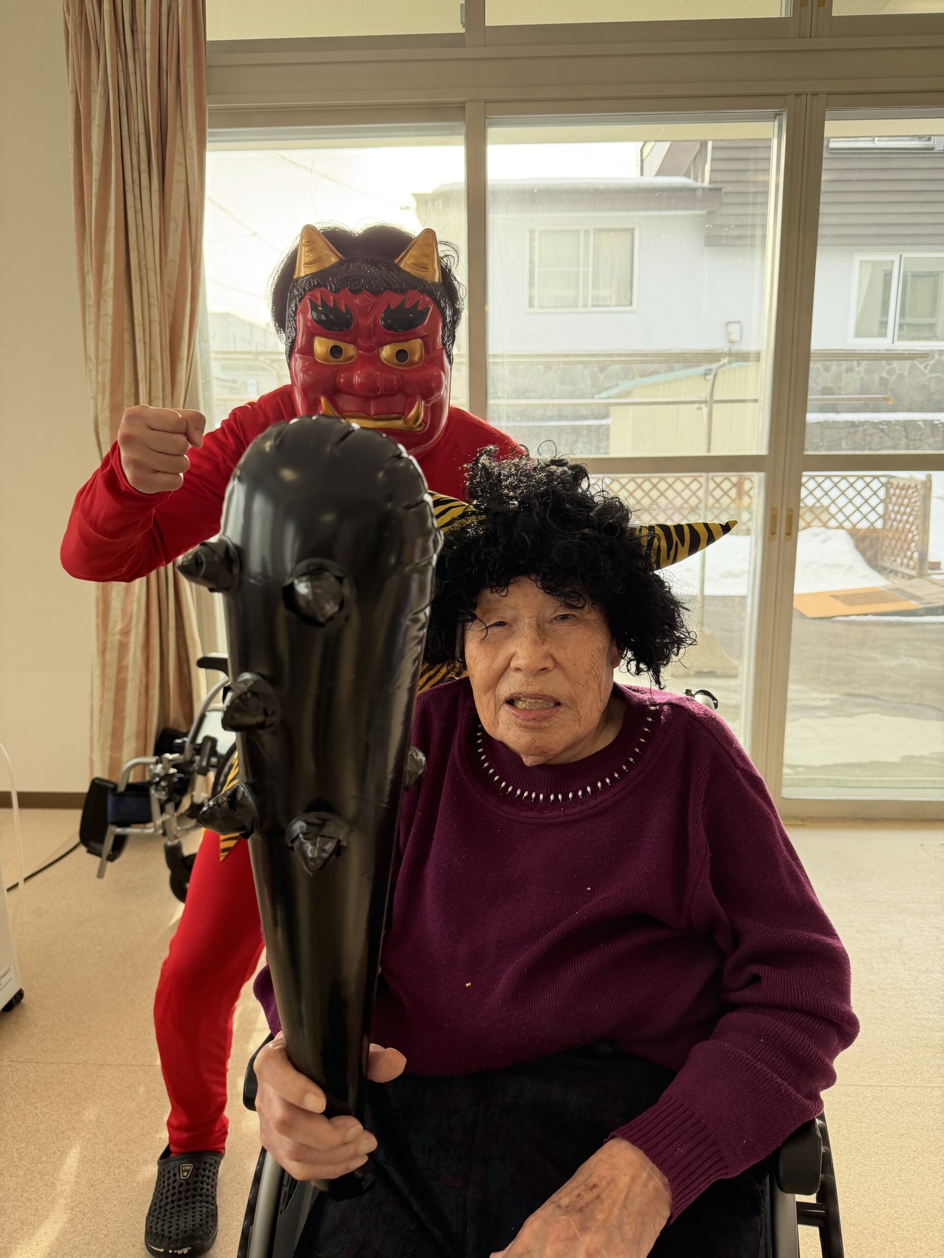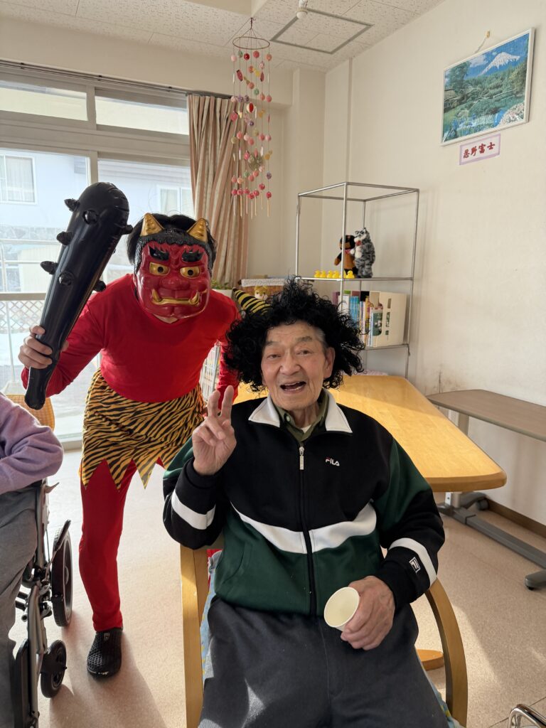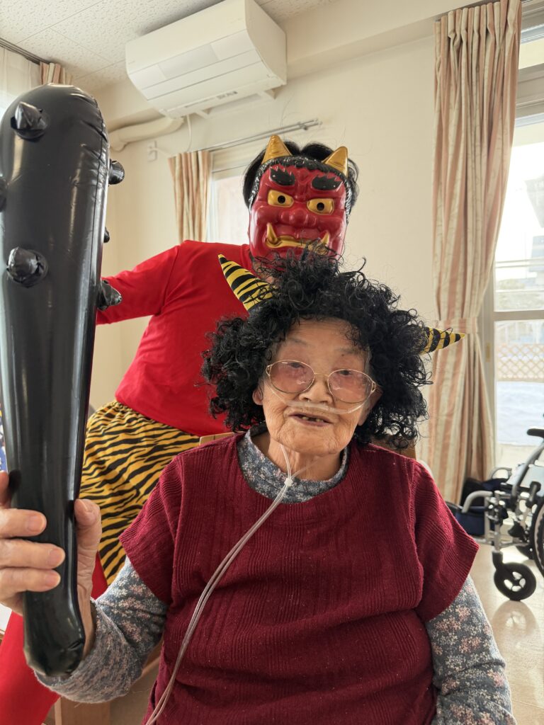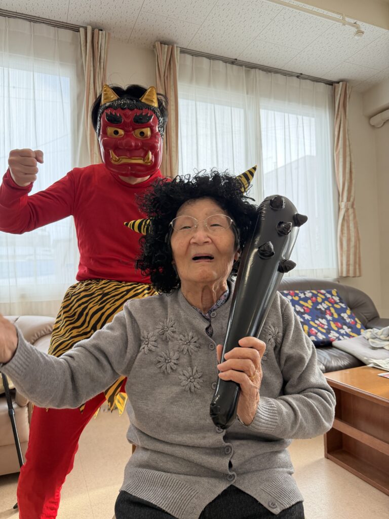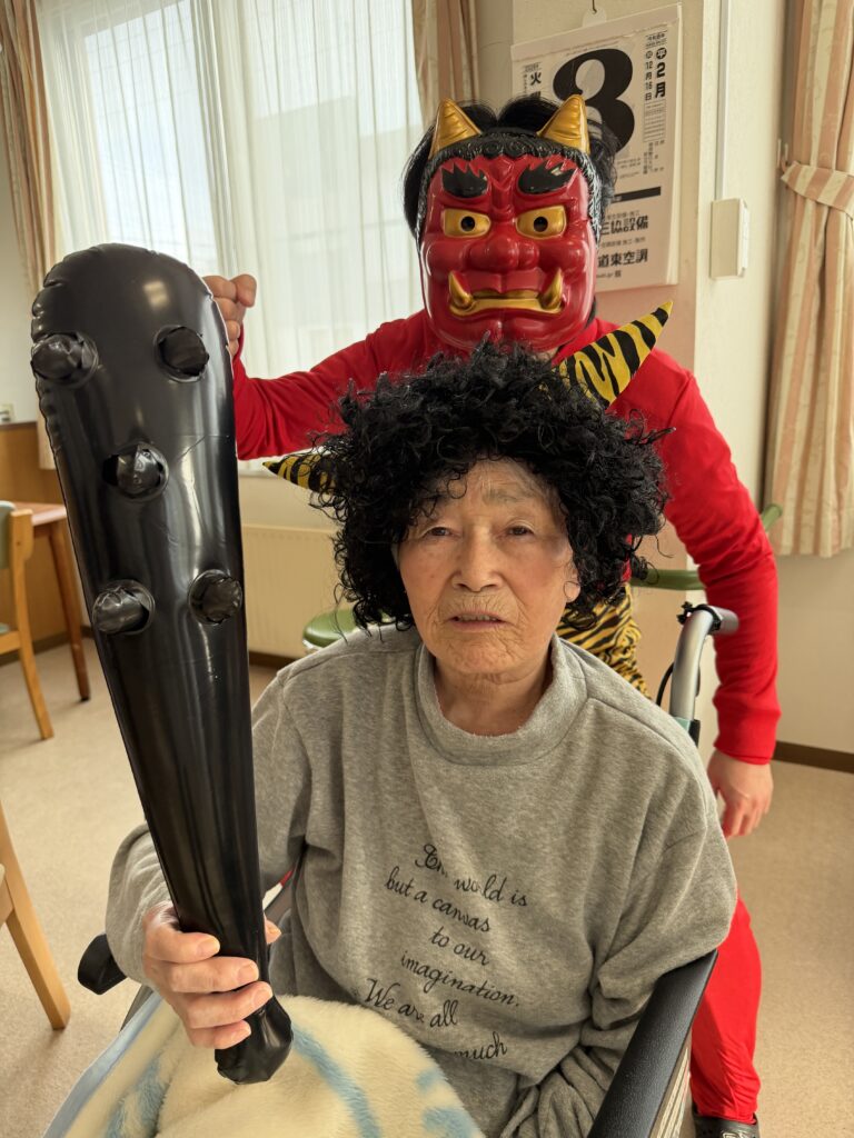 2026.2.14 【うらら1F】鬼が来た!👹 2月3日。1Fフロアにも鬼が来るとの噂が…Σ( ̄□ ̄|||) 念の為、退治出来る様に豆を持って待ち構えていたのですが、 何やら気が付いたら、鬼さんと仲良くなっちゃいまして 退治出来ず💦 一緒に記念撮影となりました(*^▽^*) < 前の記事へ 記事一覧へ >